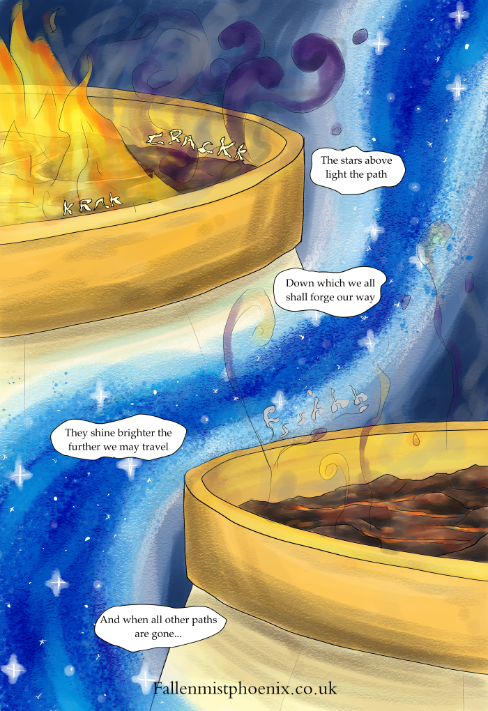 The phoenixes begin their little dance. In the background there’s a bunch more cameos, some from my friends’ comics (Engelbaum and Entanglement both have cameos in here!) and some from miscellaneous things. The far background is where most of[…]↓ Read the rest of this entry…